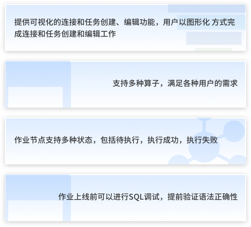 数据开发 提供数据管道,实时计算,多维分析,业务流程 凤凰彩票app下载,调度运维等数据加工处理端到端的工具集,支持复杂的数据处理模型构建,提供一站式可视化开发与管理界面,支持全托管的作业调度与灵活的调度策略,具有良好的扩展性,支持算子,函数及作业的自定义开发,极大地降低了用户构建数据处理的复杂度,专注于数据价值的挖掘和探索。 |